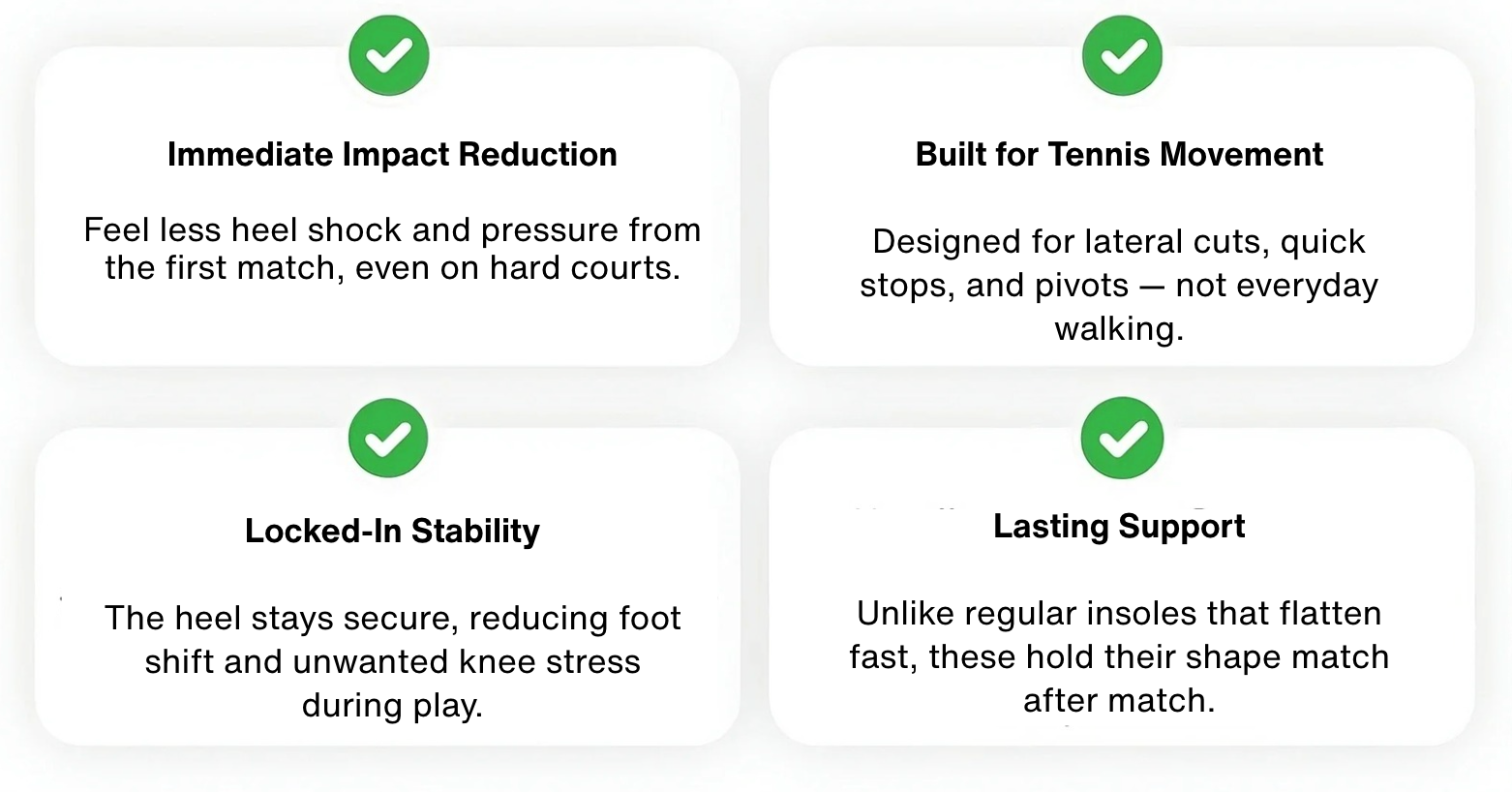 Many players notice less heel impact and better comfort from the first match, especially on hard courts.